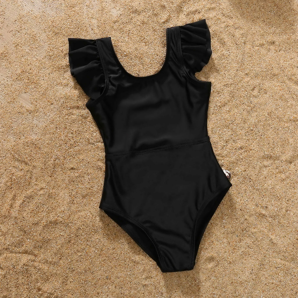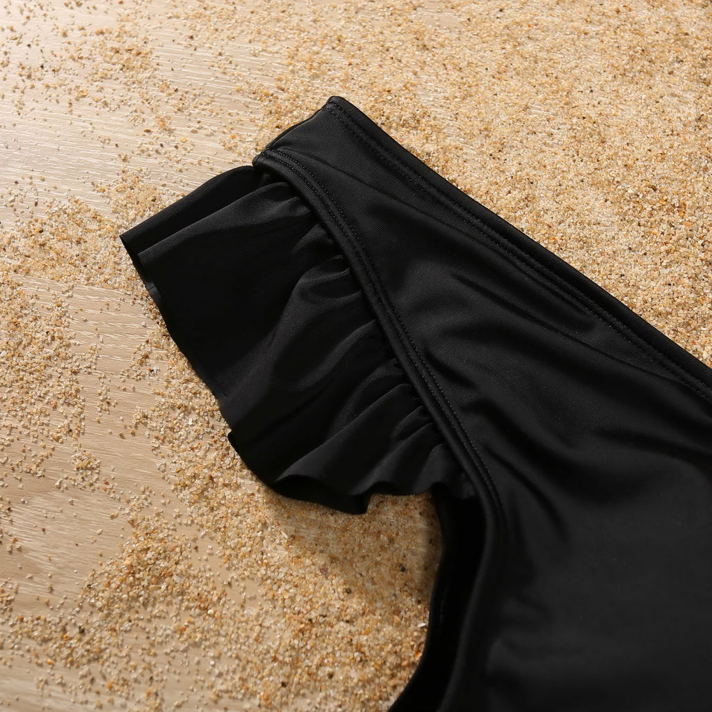 Bring some sweet style to your swim collection with our Ruffle-Neck Scoop-Back One-Piece Swimsuit from EllMii™. Our black one-piece swimsuit is accented with ruffles along the neckline for a sweet finishing touch. This swimsuit also features slim ruffle straps with a slight V- Neck for moms.